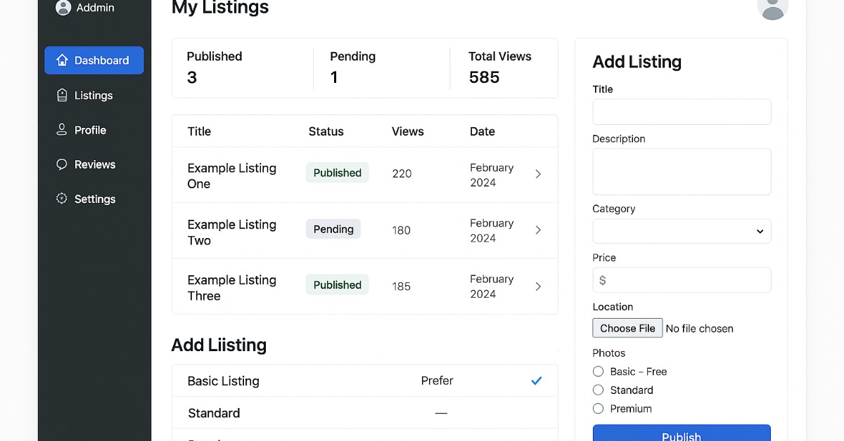 A clean dashboard for creating and editing listings, approving submissions, and keeping data tidy. Fields match your use case—no clutter you don’t need. Bulk import from a spreadsheet when you’re starting out, then bulk edit when policies change. Simple moderation queues for new listings, updates, reviews, and photos. Role-based access so staff and partners only see what they should.