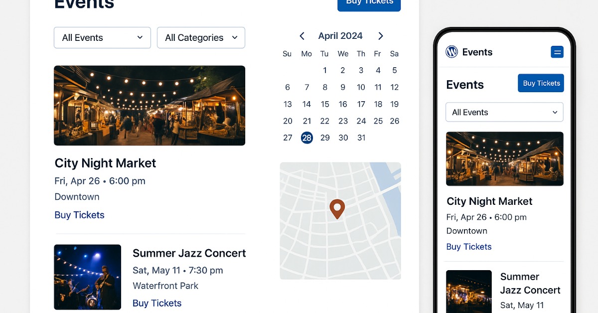 Events live on your domain with your design and content. Your blog, sponsor pages, and FAQs link naturally into the ticket flow. If you add or already have a phone app, WordPress remains the point of truth—schedule, inventory, and ticket status stay in sync.