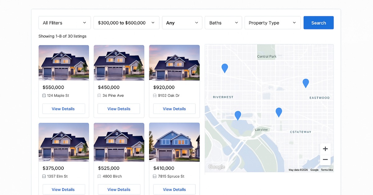 House-hunters want three things: a fast search, details that feel trustworthy, and an easy way to ask for a tour. We build real estate sites inside WordPress that do all three—map search that flies, listing pages that answer questions, and forms that route leads to the right agent.