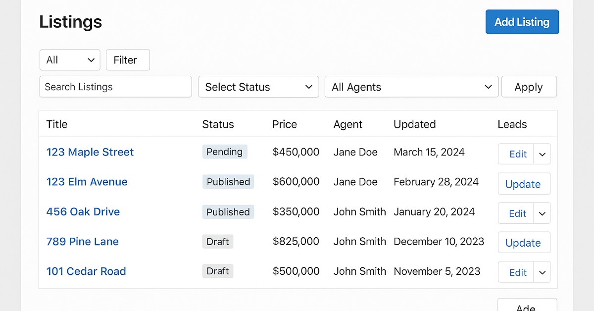 A tidy dashboard to add and edit listings, set status (active, pending, sold), schedule open houses, and mark featured properties. Bulk import from a spreadsheet when you’re starting out; bulk edits when prices change. Clear lead routing: assign by office, area, or listing agent. Simple moderation for photos and remarks. Role-based access so staff, agents, and partners only see what they should.